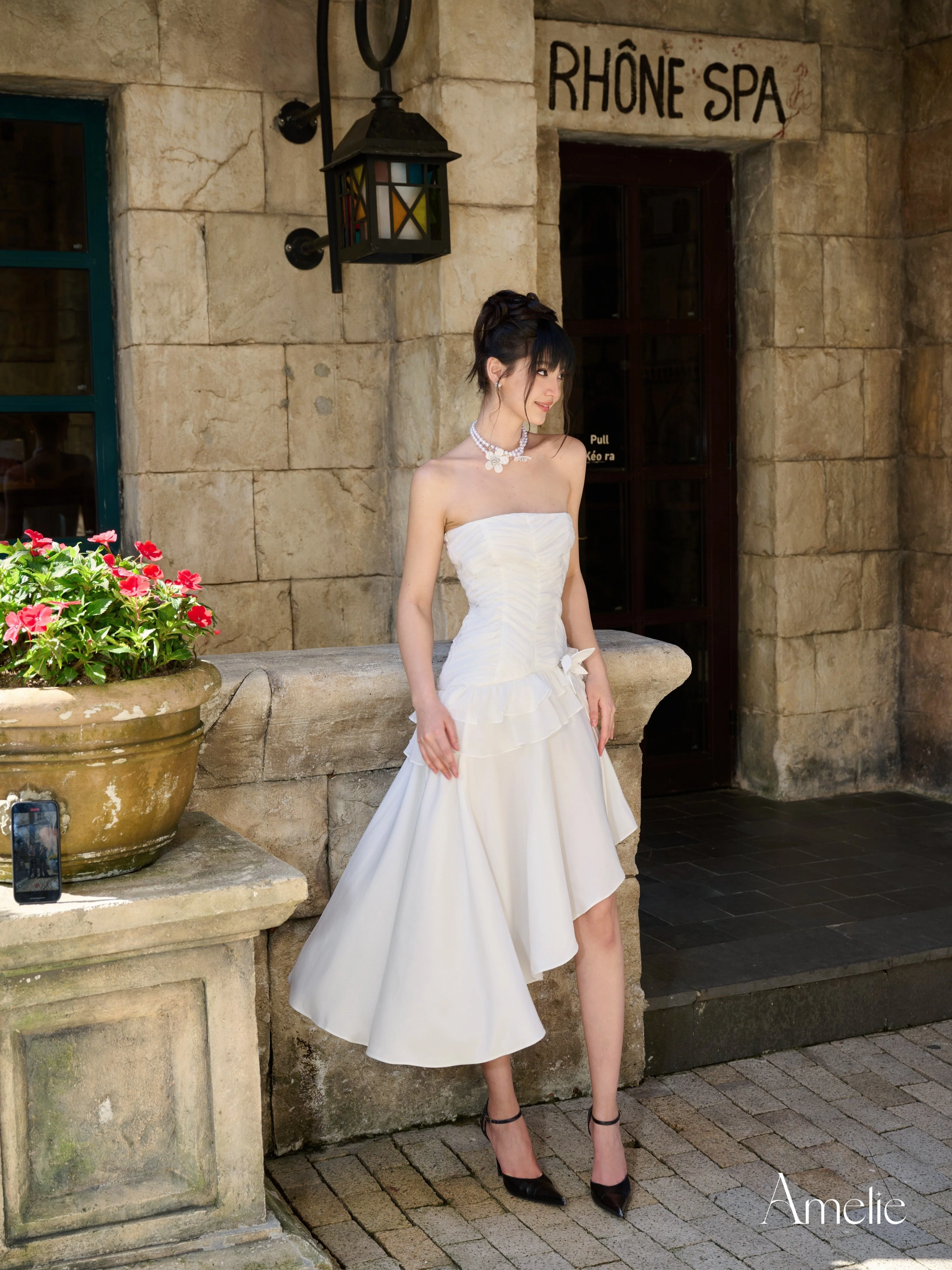 - Asymmetrical skirt (one side long, one side short)